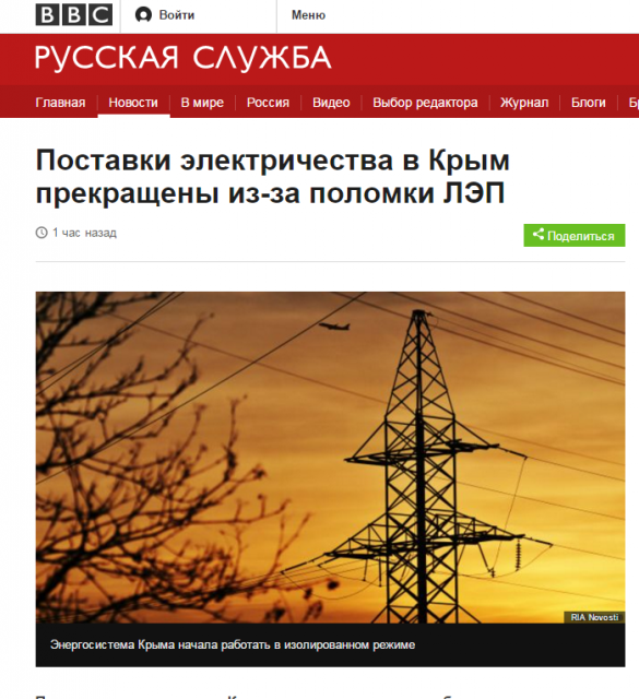 Русская служба Би-би-си в качестве причины прекращения энергоснабжения Крыма назвала «поломку ЛЭП».