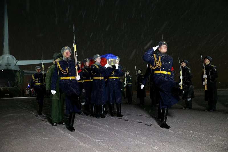 На аэродроме Чкаловский военный самолет с телом погибшего летчика подполковника Олега Пешкова встречали Министр обороны России генерал армии Сергей Шойгу и главнокомандующий Воздушно-космическими силами России генерал-полковник Виктор Бондарев.