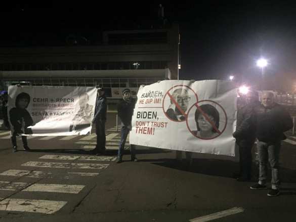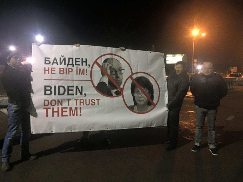 Впрочем, они решили встретить Байдена по-своему: в отличие от Кличко, они держали в руках не каравай, а стояли на летном поле, держа в руках плакаты с портретами Арсения Яценка и Натальи Яресько с надписями «Байден, не верь им!», «Они убивают бизнес».