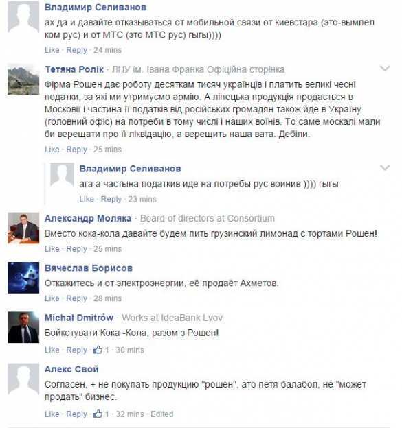 Интересны комментарии к этом призыву на украинских новостных ресурсах: одни призывают пить «дружественный» грузинский лимонад, другие — отказаться от электроэнергии, ведь её поставляет опальный олигарх Р. Ахметов.