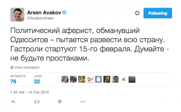 «Политический аферист, обманувший одесситов — пытается развести всю страну. Гастроли стартуют 15-го февраля. Думайте — не будьте простаками», — написал он.
