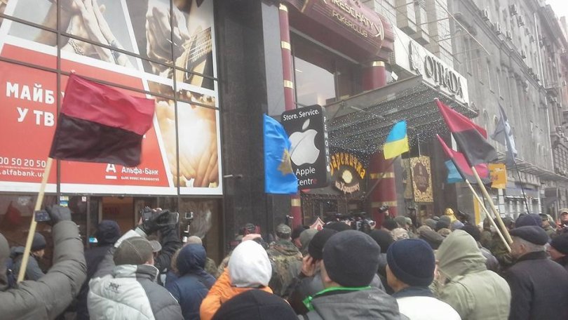 Протестующие в Киеве хотели вынести стол из «Альфа-Банка», но полиция не позволила.