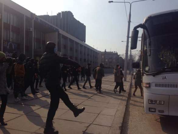 12:22 — приехал еще один автобус из Мелитополя. Радикально настроенные молодчики встречают его множеством брошенных яиц. В автобусе слышен плач и крики женщин. Часть экстремистов пытается прорваться внутрь автобуса, но их останавливают.