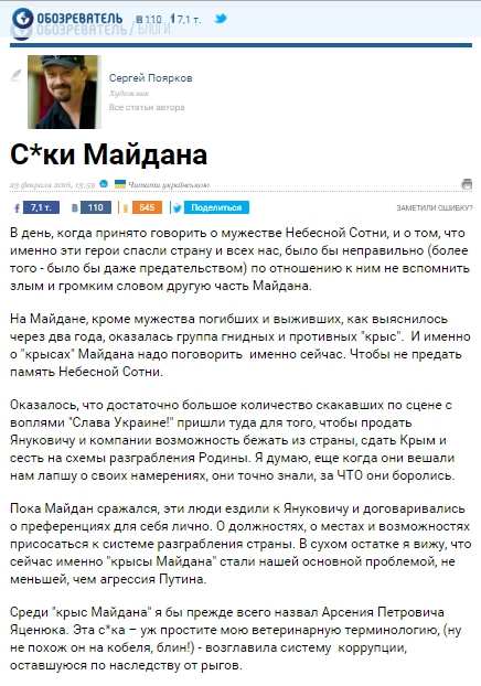 «В день, когда принято говорить о мужестве Небесной Сотни, и о том, что именно эти герои спасли страну и всех нас, было бы неправильно (более того — было бы даже предательством) по отношению к ним не вспомнить злым и громким словом другую часть Майдана, — пишет Поярков. — На Майдане, кроме мужества погибших и выживших, как выяснилось через два года, оказалась группа гнидных и противных „крыс“. И именно о „крысах“ Майдана надо поговорить именно сейчас. Чтобы не предать память Небесной Сотни.