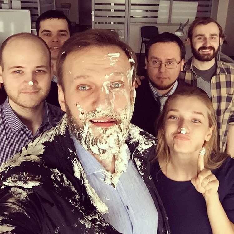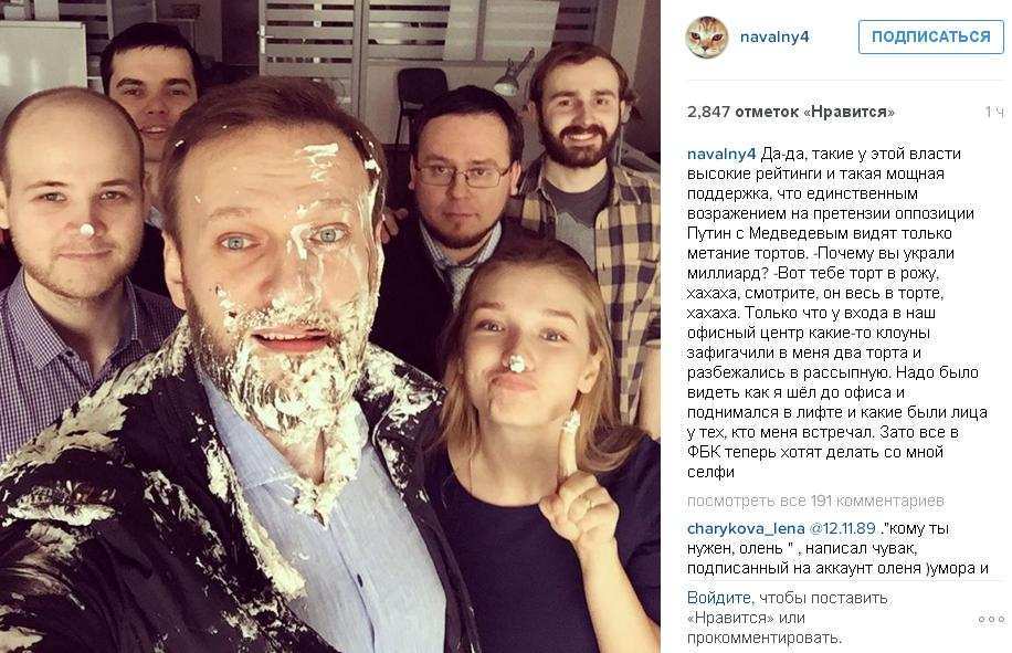 «Только что у входа в наш офисный центр какие-то клоуны зафигачили в меня два торта и разбежались врассыпную. Надо было видеть, как я шел до офиса и поднимался в лифте, и какие были лица у тех, кто меня встречал. Зато все в ФБК теперь хотят делать со мной селфи».