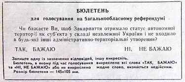 1 декабря 1991 года на территории Закарпатской области проходил местный референдум по предоставлению области статуса автономии в составе Украины. Тогда 78,6% населения высказались «за» при общей явке 83%.