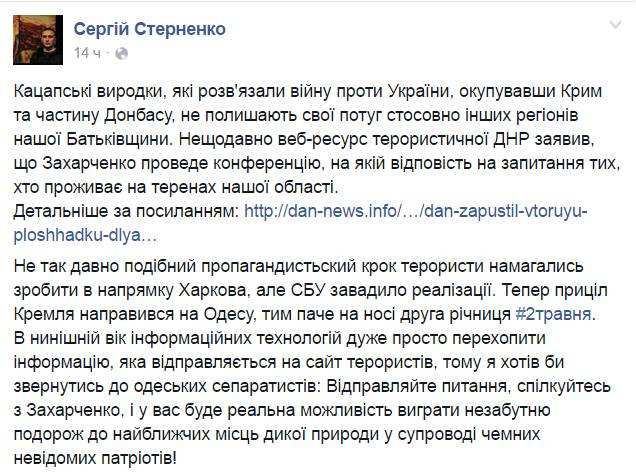 «В нынешний век информационных технологий очень просто перехватить информацию, которая отправляется на сайт террористов, поэтому я хотел бы обратиться к одесским сепаратистам: отправляйте вопросы, общайтесь с Захарченко, и у вас будет реальная возможность выиграть незабываемое путешествие в ближайшие места дикой природы в сопровождении вежливых неизвестных патриотов!» — паясничает Стерненко.