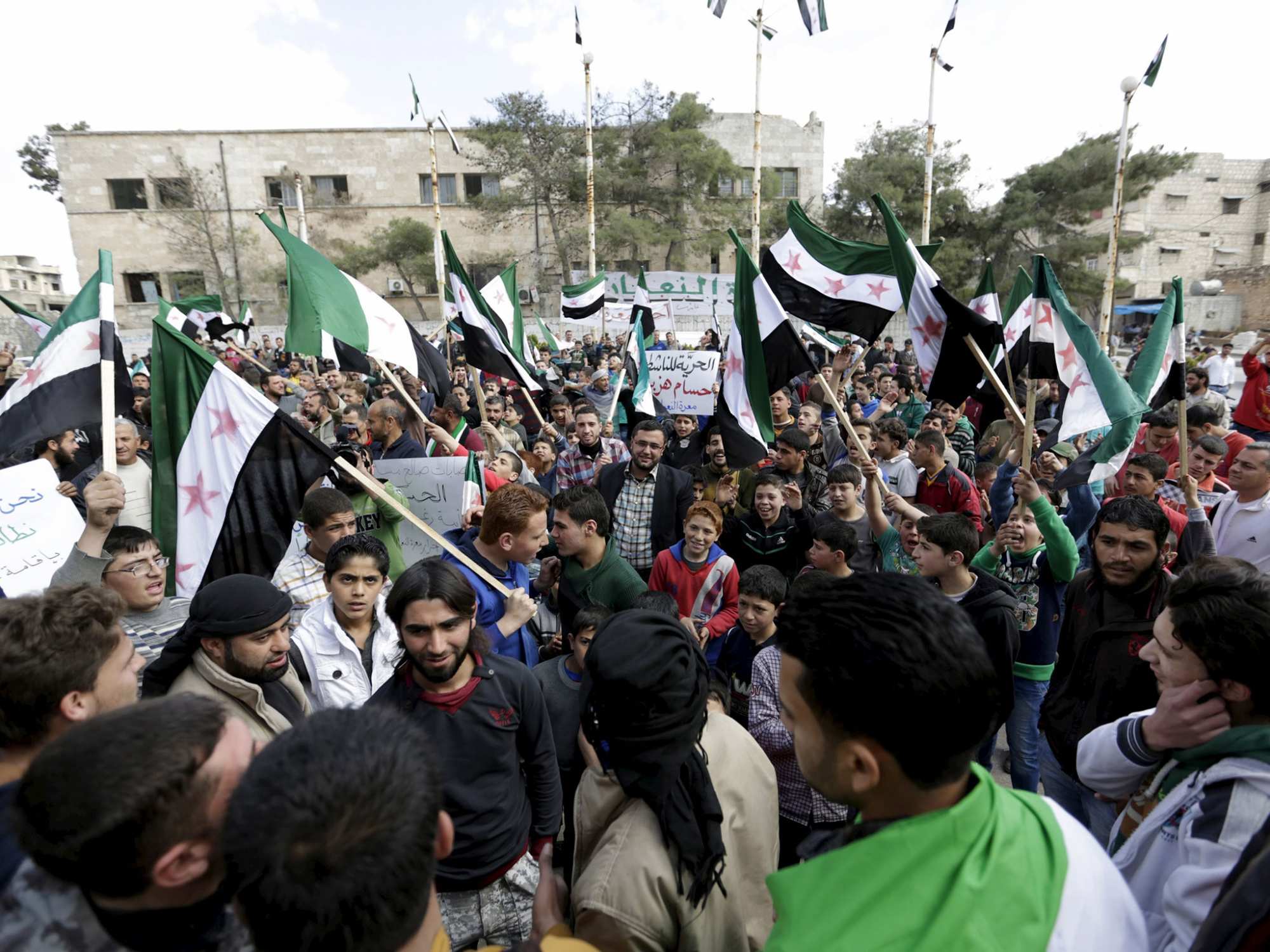Во время митинга в городе Мааррет-эн-Нууман, который проводили сторонники так называемой «Свободной сирийской армии» (на видео — с зелено-чёрно-белыми флагами). В какой-то момент на митинг явились сторонники «Джебхат ан-Нусры»* — сирийской ветви «Аль-Каиды»*.