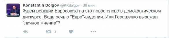 Ждем реакции Евросоюза на это новое слово в демократическом дискурсе. Ведь речь о „Евро“-видении. Или Геращенко выражал „личное мнение“?» — прокомментировал заявление Геращенко Константин Долгов.