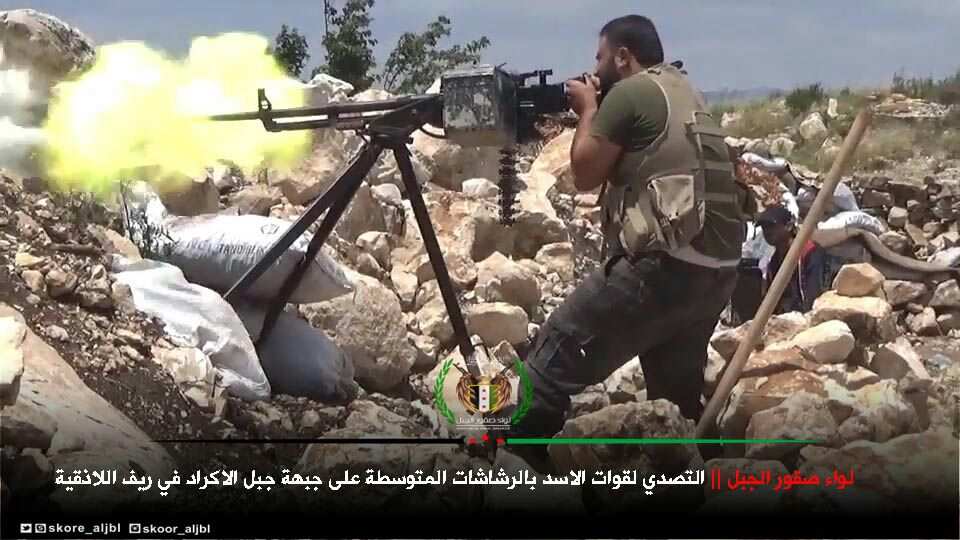 На главном фото: пулеметчик «Ахрар аш-Шам» в Латакии, на фото внизу — зенитка «Джебхат ан-Нусры» ведет огонь в Латакии, а также гаубица Д-30, пулеметы и ПТУР TOW боевиков ССА в Алеппо и др. провинциях.