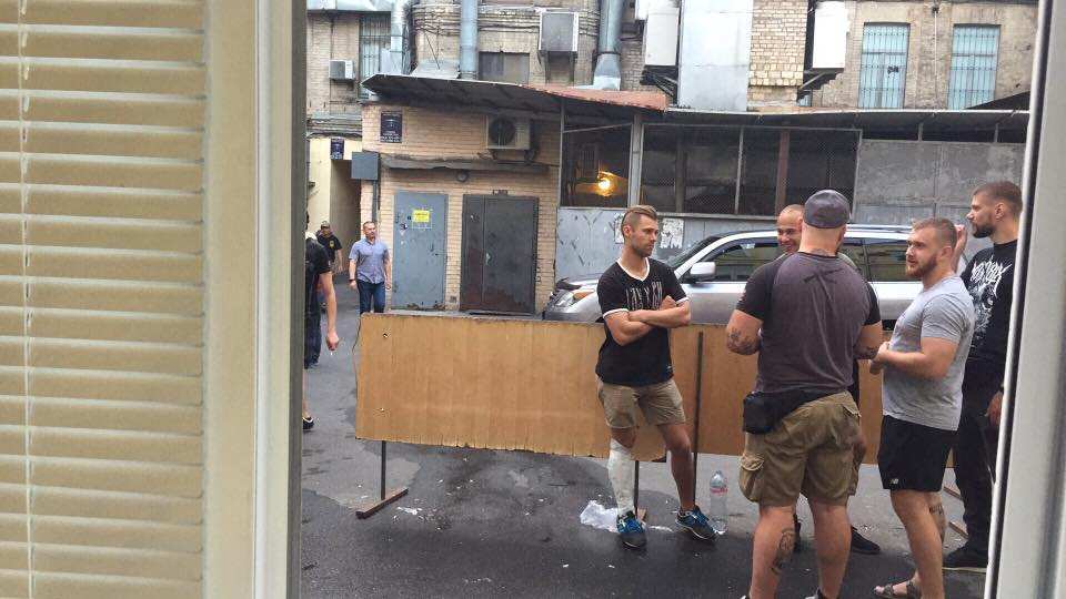 Всю ночь в Печерском райсуде продолжался цирк с участием непонятных людей, с оружием и без опознавательных знаков (в том числе, из карательных батальонов «Айдар», «Азов», «Торнадо», «Донбасс» и члены «Правого сектора»*), которые блокируют здание в том числе и снаружи, перегородив подъезд к нему опрокинутыми столами и шинами, которые они угрожают поджечь в случае штурма полиции.