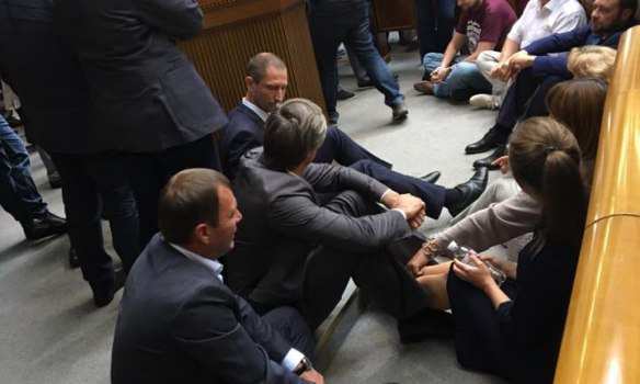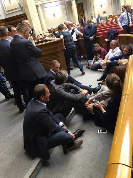 После этого соратники Ляшко сели прямо в проходе сессионного зала. Примечательно, что Рада продолжила работу, не обращая внимания на сидячий акт протеста.