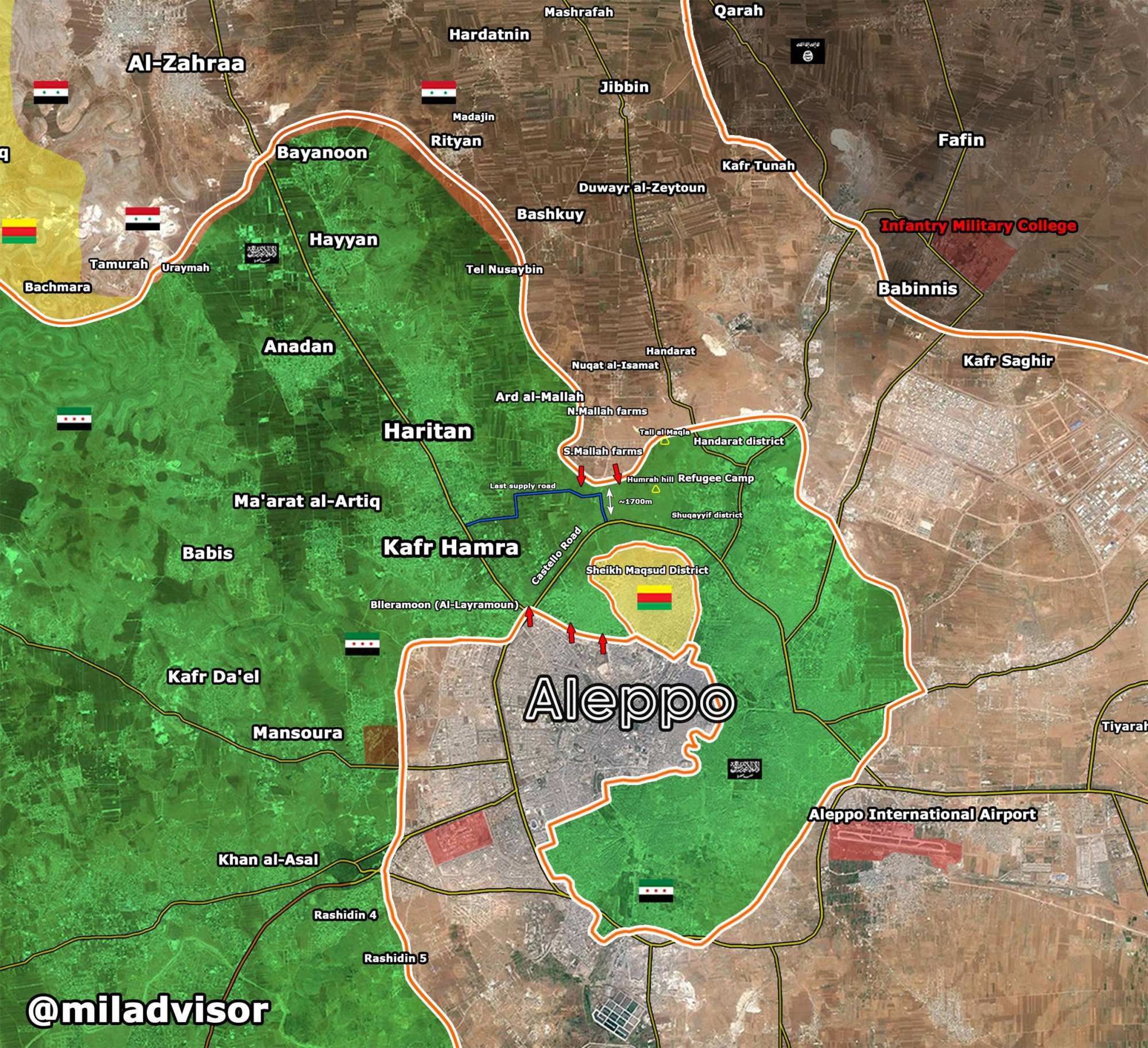 СМИ боевиков признает, что «Аль-Кастелло» — единственный маршрут поставок в подконтрольную боевикам часть Алеппо — полностью отрезан из-за сильного обстрела по площадям, что делает невозможным въезд в город или выезд из него.