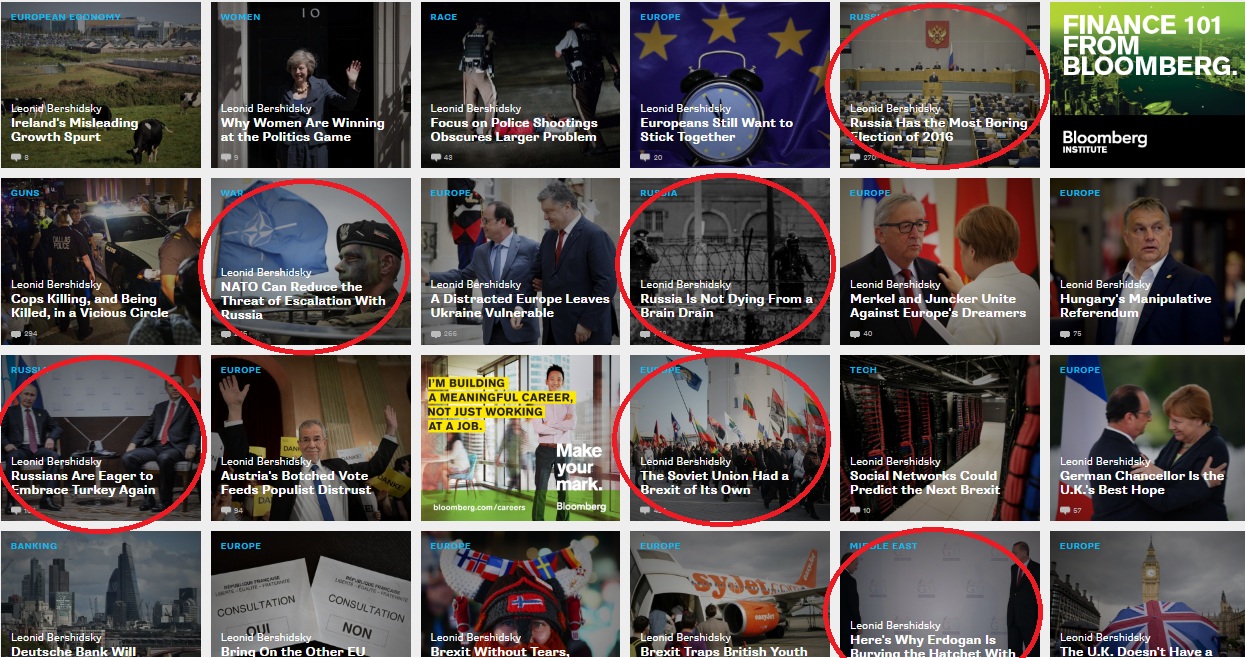Разумеется, он пишет и о Brexit, и о расстреле полицейских в США и о других значимых мировых событиях. Однако значительная доля его материалов посвящена России — причем не просто России, а ее проблемам, недостаткам и «дикости», а также личности Владимира Путина, о котором Бершидский также пишет с воинствующей неприязнью.