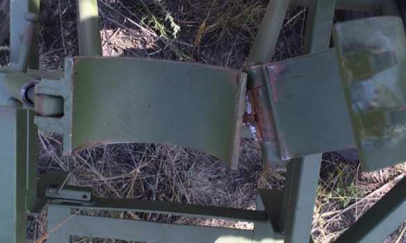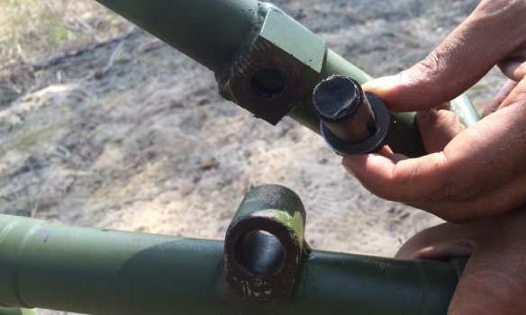 Также банально отвалился механизм горизонтирования (есть на фото) и также фото нового (!) колесного хода, крепление ствола просто отвалилось. После пятого выстрела механизм одного из миномета начал клинить.
