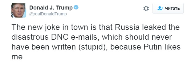 «The new joke in town is that Russia leaked the disastrous DNC e-mails, which should never have been written (stupid!), because Putin likes me».