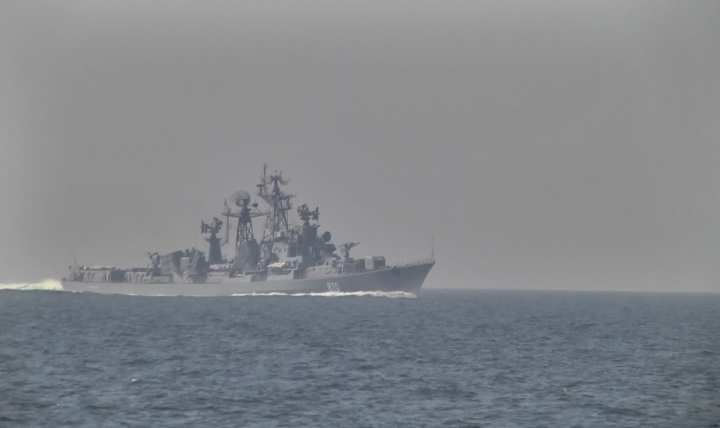 После третьего круга самолет удалился, но ему на смену пришел сторожевой корабль ВМС Российской Федерации «Сметливый».