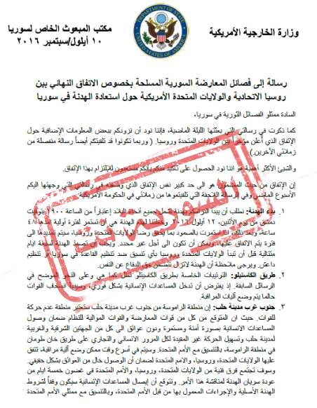 10 сентября ресурсы «сирийской оппозиции» опубликовали копии письменного обращения Госдепартамента США ко всем вооруженным группам «оппозиции» на территории Сирии с призывом присоединиться к режиму прекращения огня с 12 сентября (см. скрин ниже).