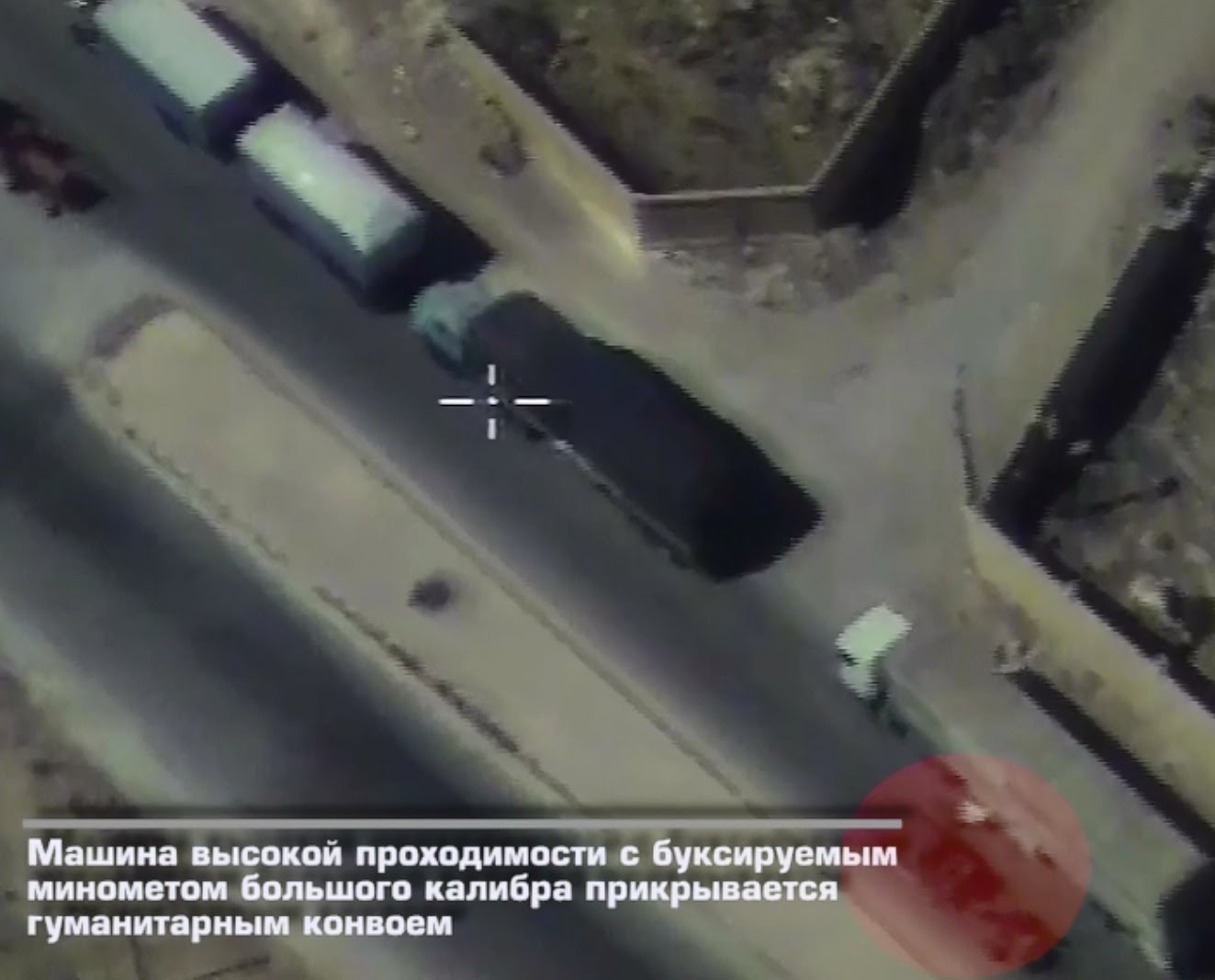 Речь идет о видеокадрах, распространенных Министерством обороны РФ и свидетельствующих о том, что среди грузовиков с памперсами и одеялами для беженцев следовал военный автомобиль с крупнокалиберным минометом, принадлежащий сирийским боевикам.