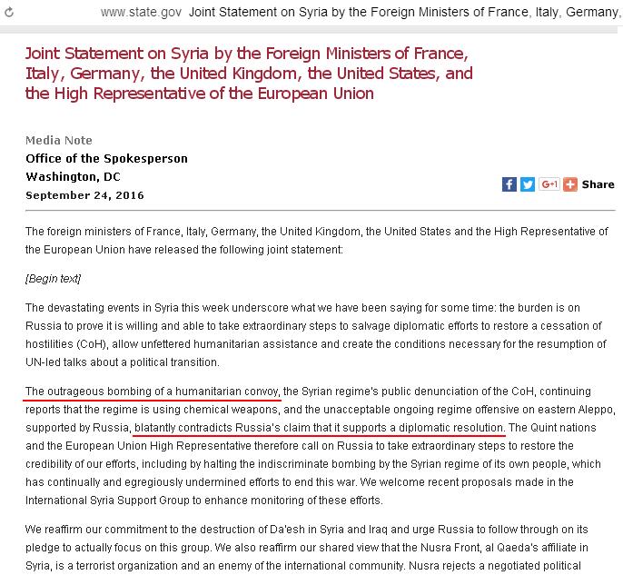 Однако все неточности и явная притянутость версии о причастности к уничтожению конвоя ВКС России или правительственных сил Сирии не помешали внешнеполитическим ведомствам США, Германии, Франции, Великобритании и Италии, а также верховному представителю ЕС Федерике Могерини выпустить совместное заявление с жесткой критикой действий Москвы в Сирийской Арабской Республике.