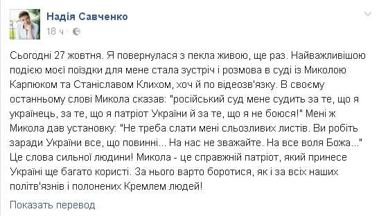 На своей странице в соцсети Савченко написала, что «еще раз вернулась из ада живой» и поплакалась о «плененных Кремлем людях».