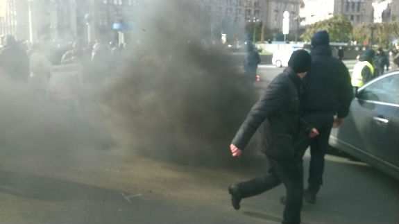 Днем 3 ноября на Крещатике горели шины и дымовые шашки. Протестующие перекрыли автомобильное движение, а полиция пытается оттеснить митингующих с проезжей части.