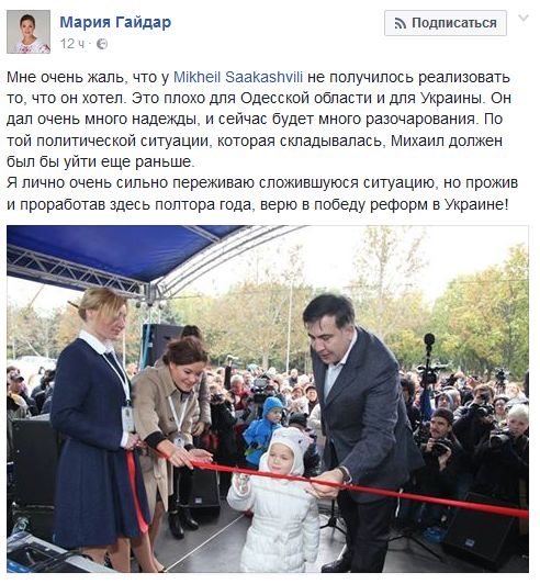 Советник одесского губернатора, протеже Саакашвили Мария Гайдар прокомментировала решение своего патрона подать в отставку.
