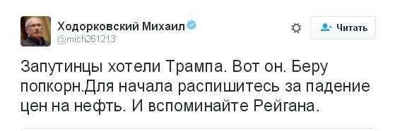 «Запутинцы хотели Трампа. Вот он. Беру попкорн. Для начала распишитесь за падение цен на нефть. И вспоминайте Рейгана», — написал Ходорковский на своей странице в соцсети, намекая на то, что после избрания Рейгана в странах соцлагеря были определенные иллюзии о том, что новый президент окончит холодную войну и положит конец гонке вооружений. По факту же период правления Рейгана оказался крайне напряженным для советско-американских отношений.