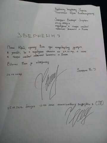 В заявлении на имя нардепа Андрея Тетерука Заверуха сообщила, что объявляет сухую голодовку и «отказывается от какого-либо медицинского вмешательства, которое может понадобится вследствие ее бессрочной голодовки».