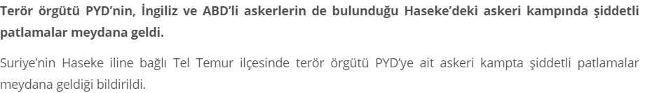 «Последовали тяжелые взрывы, пожар и большие разрушения в лагере, где войска США и Великобритании готовят курдов. В результате есть убитые и раненые американцы, англичане и курды.