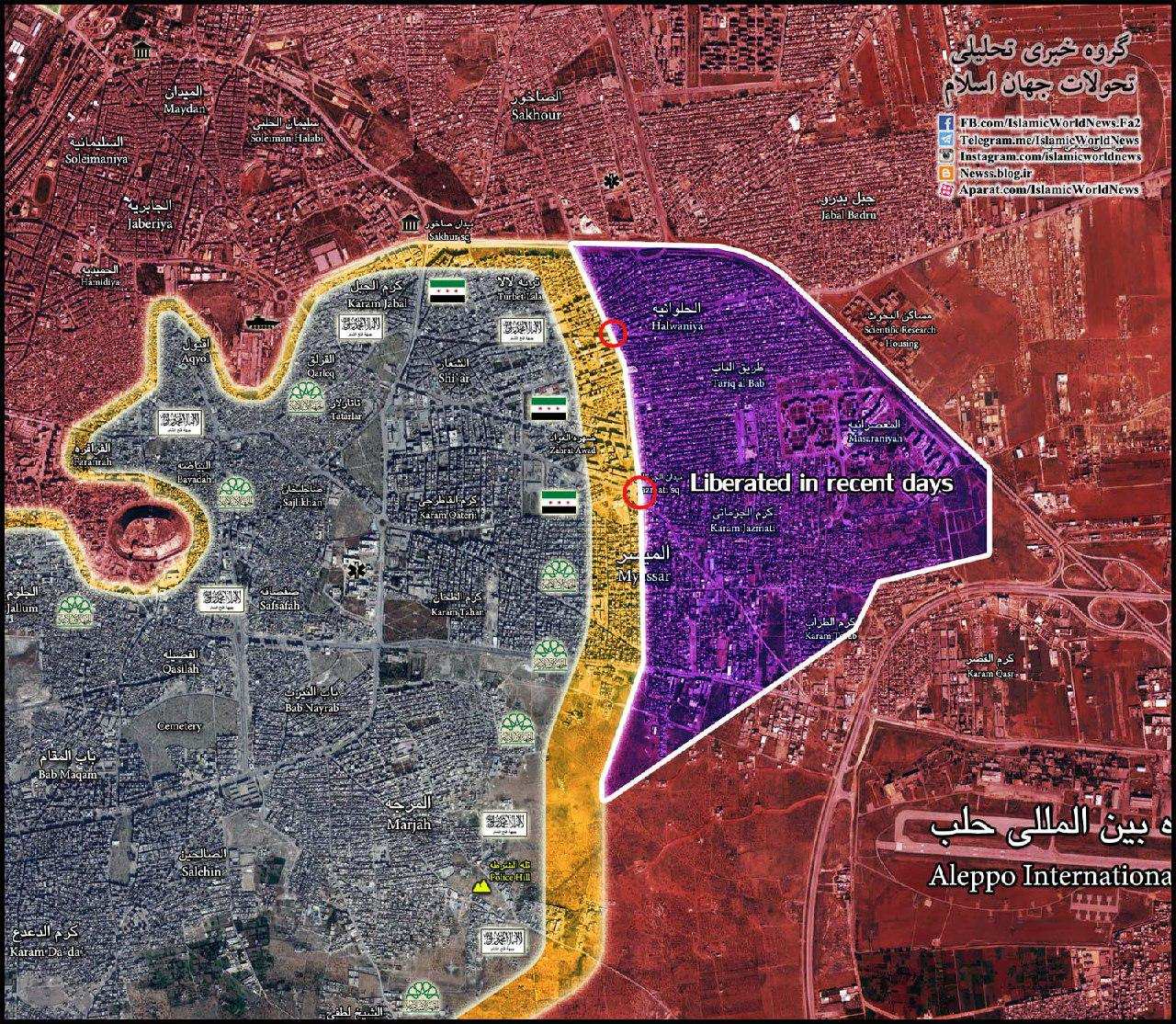 «На карте, показывающей прогресс Армии Сирии в возвращении восточного Алеппо, виден контроль кольцевых дорог в Аль-Джазмати и в Аль-Хальвания вниз на пути к Ханано. А также над рядом строений в районе Аль-Катри», — резюмируют в «Хезболле».