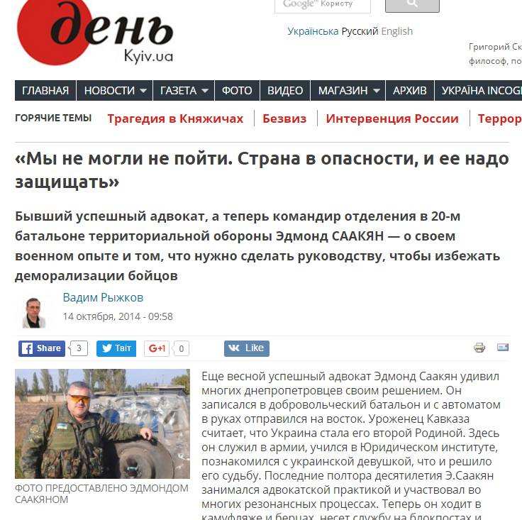 Шокирующим кадром поделилась с собеседником в Facebook его жена — Светлана Саакян, сопроводив фотографию комментарием: «Вот он, с лапкой ополченца, на счастье) как американские инструкторы учили)».