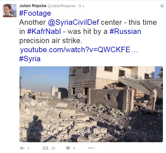 Разумеется, он также с завидной регулярностью публикует голословные обвинения в адрес России: якобы ВКС РФ уничтожили тот или иной гражданский объект в Сирии.