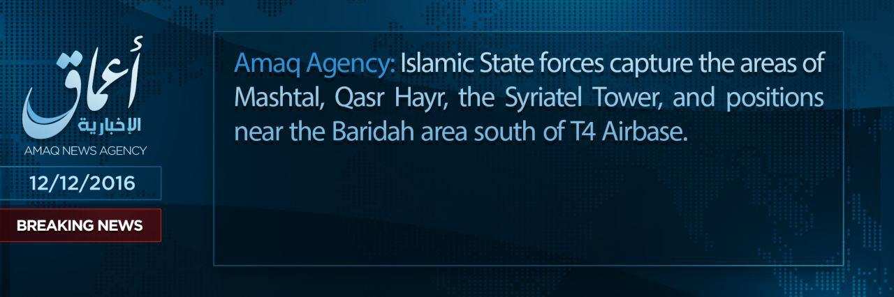 Вечером медиа-крыло ИГИЛ «агентство «Амак» заявило о взятии н.п. Маштал, Кваср Хайр, Вышки «Сириатель», а также позиций южнее Т-4.