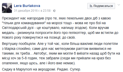 «Президент нас наградил. О том, каких адских двух суток на морозе, с кофе „только для командования“, это стоило, напишу позже. Когда вручал медаль — рискнула попросить его о вертолете, чтобы мы успели до Нового года вернуться на позиции, к своим. Вертушку пообещали. Но в то время, когда более важные люди полетели из Марика спокойно, именно для нас метеоусловия вдруг оказались не такими, как надо», — отметила она.