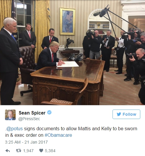 «Президент подписал документы, позволяющие Мэттису и Келли принять присягу, а также указ по Obamacare», — говорится в сообщении.