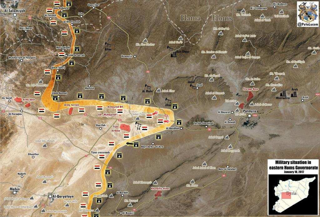 В эти выходные в боях на востоке провинции Хомс наконец наступил перелом в пользу правительственных войск, после того как армейцы взяли под контроль господствующую высоту — гору Джабаль Тияс восточнее насосной станции Т-4.
