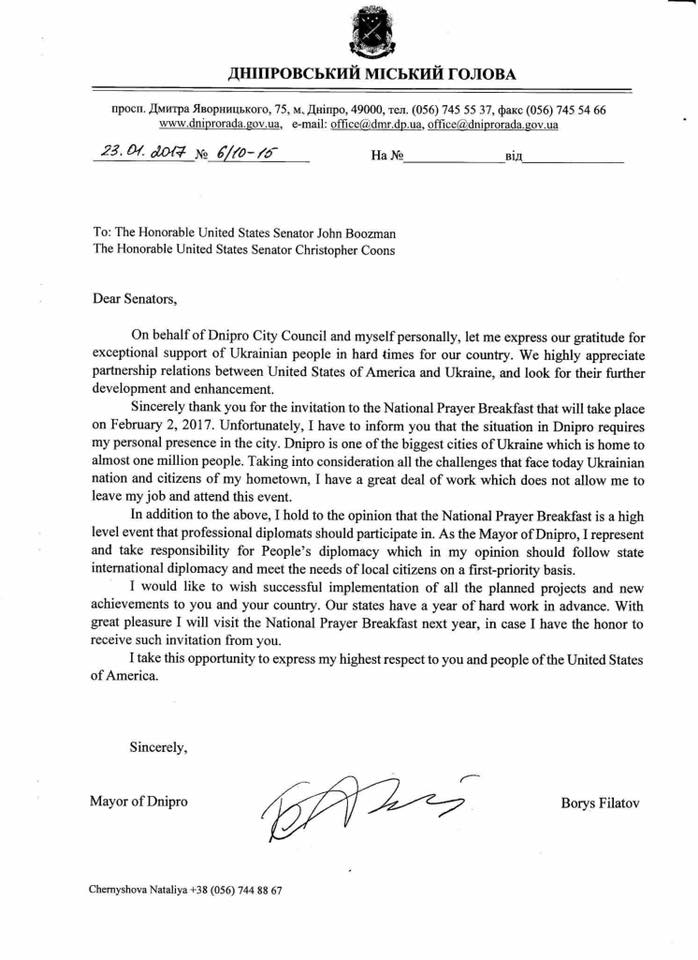 В официальном ответе сенаторам мэр Днепропетровска поблагодарил их за приглашение и объяснил, что ситуация в городе сейчас требует его обязательного присутствия, пообещав обязательно приехать на завтрак к Трампу в следующем году, если его снова пригласят.