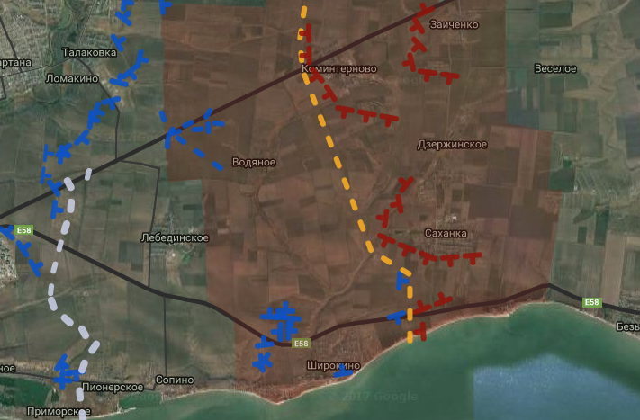 Воспользовавшись ситуацией в районе авдеевской промзоны, противник силами до двух взводов 36 обрМП ВСУ и боевиков «Правого сектора»* при поддержке трех БМП с 10 часов утра предпринял попытку прорыва на Мариупольском направлении в районе н.п. Коминтерново, начав свои атаки после традиционного обстрела из крупнокалиберной артиллерии.