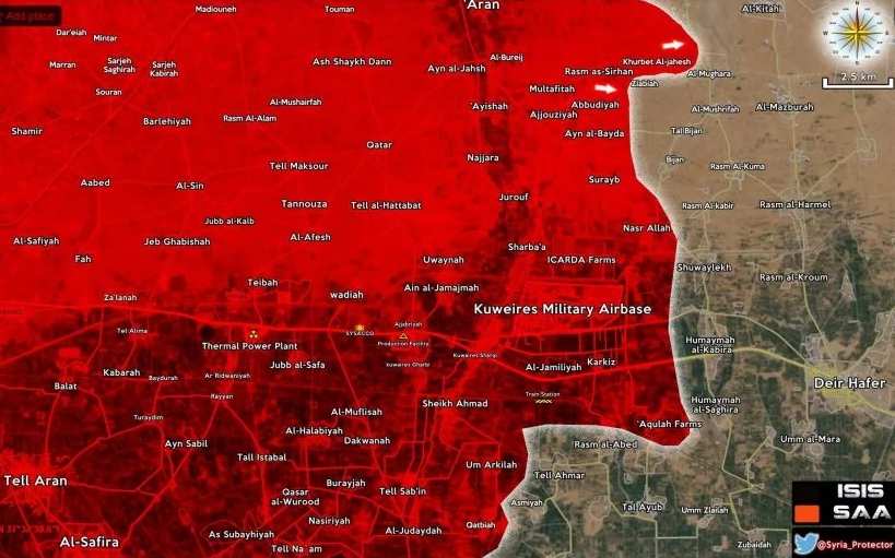 Добавим, что на данный момент времени бои ведутся на северо-востоке по периметру военного аэродрома Кувейрис (Квейрис), 5 населенных пунктов, включая Абу-Джаббер, Беджан и Аль-Магара, полностью очищены от террористов ИГИЛ.