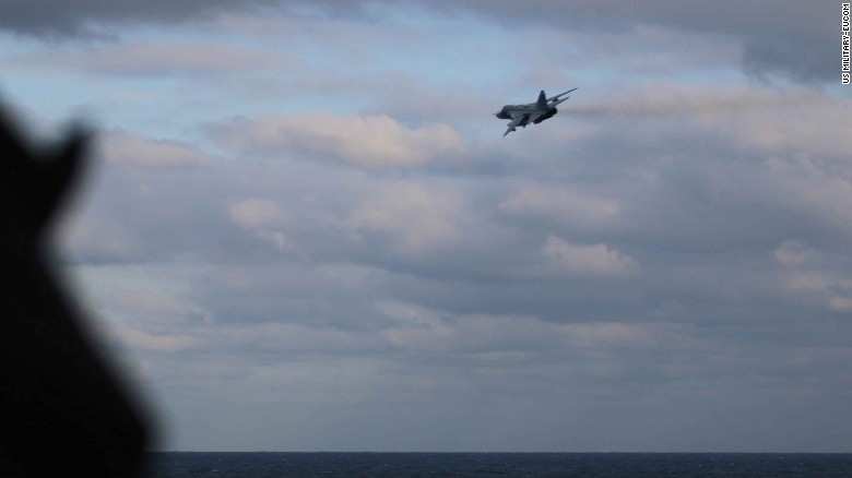 Телекомпания CNN показала кадры, снятые американскими моряками с эсминца «Портер». На фото пара фронтовых бомбардировщиков ВКС России Су-24М пролетают вблизи военного корабля «условного противника» в Черном море.
