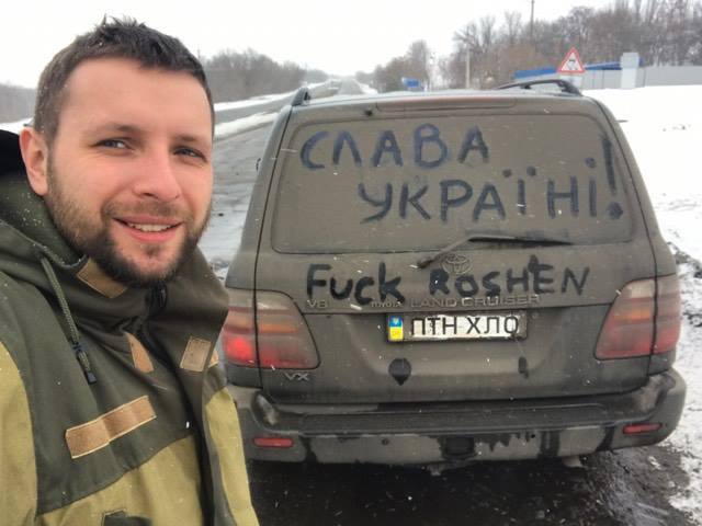 Обращает на себя внимание то, что надпись Fuck Roshen на автомобиле сделана не краской, а пальцем по грязи. Как и надпись: «Слава Украине!».