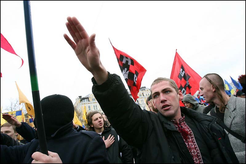 Тем не менее, уверяю вас, настоящие продолжатели дела Коновальца, Мельника, Бандеры и Шухевича прекрасно осведомлены, кого именно уничтожали их герои — просто сегодня, рассчитывая на союз с Западом, они вынуждены скрывать истинную суть подробно разработанной еще перед Второй мировой войной националистической идеологии, они, к великому своему сожалению, лишены возможности открыто поднять на знамена лозунги тех времен. Хотя рядовые неонацисты вполне могут позволить себе вскидывать руки в характерном приветствии, размещать нацистские символы на эмблемах, позировать на камеры под нацистскими знаменами.