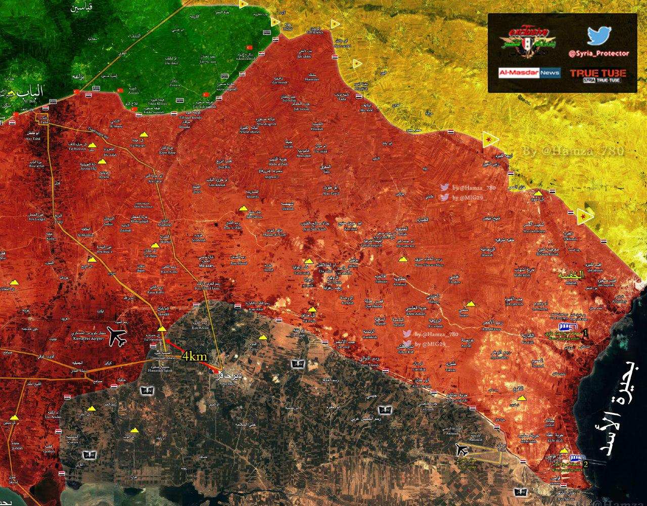 В результате сегодняшних завоеваний Сирийская Арабская армия теперь прорывается на юг в сторону к авиабазе Аль-Джирах и равнинам Маскана, эти два района являются воротами в провинцию Ракка.