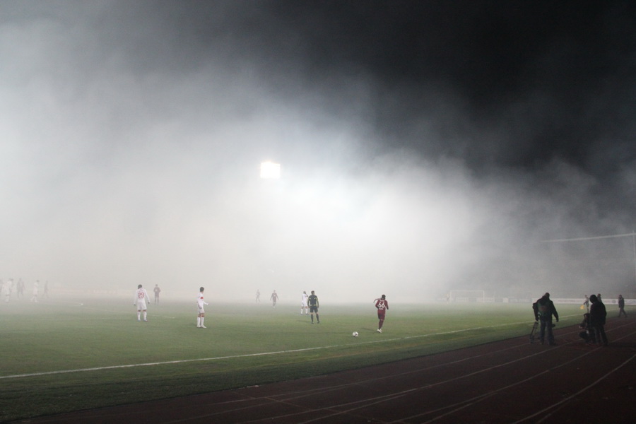 На видеозаписи с матча видно, как футболисты обеих команд закрывают лица игровыми майками и вещами, переданными им ассистентами, а зрители на трибунах прячутся за фанатскими шарфами.