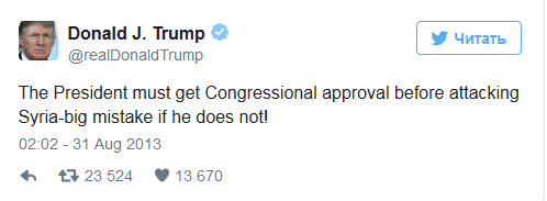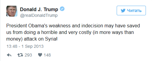 Первые записи в Twitter, где Трамп высказывает свою позицию относительно внешней политики США касательно ситуации в Сирии, появились еще в 2013 году.