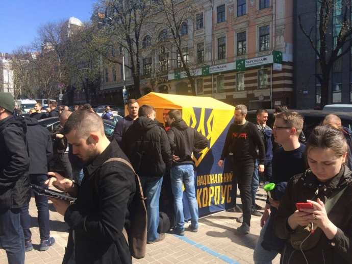 Десятки «активистов» выстроились перед зданием банка, у входа радикалы традиционно установили палатки.
