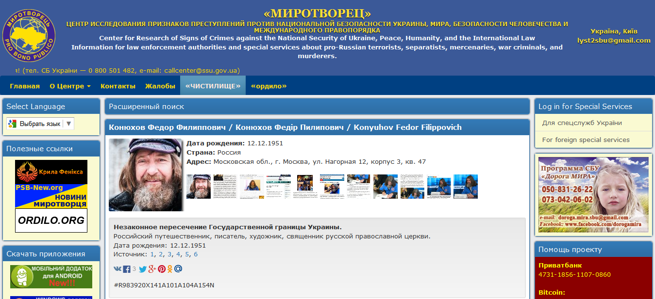 Известный российский путешественник и любитель экстрима Федор Конюхов оказался в списках украинского сайта «Миротворец». Конюхов попал в рубрику «Чистилище».