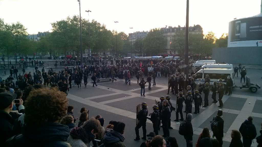 Ожидалось, что массовый митинг протеста против выборов «Ночь баррикад» начнется на площади Бастилии в 18.00 (19.00 мск). На площади собрались уже несколько сот человек, в толпе зажгли файер.