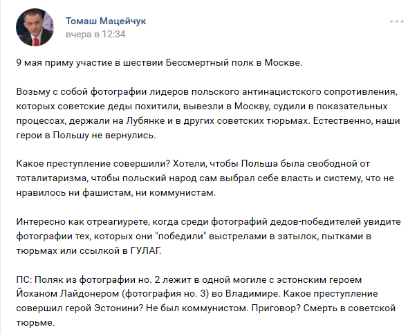 «Интересно, как отреагиурете, когда среди фотографий дедов-победителей увидите фотографии тех, которых они „победили“ выстрелами в затылок, пытками в тюрьмах или ссылкой в ГУЛАГ», — написал Мацейчук на своей странице в соцсети.